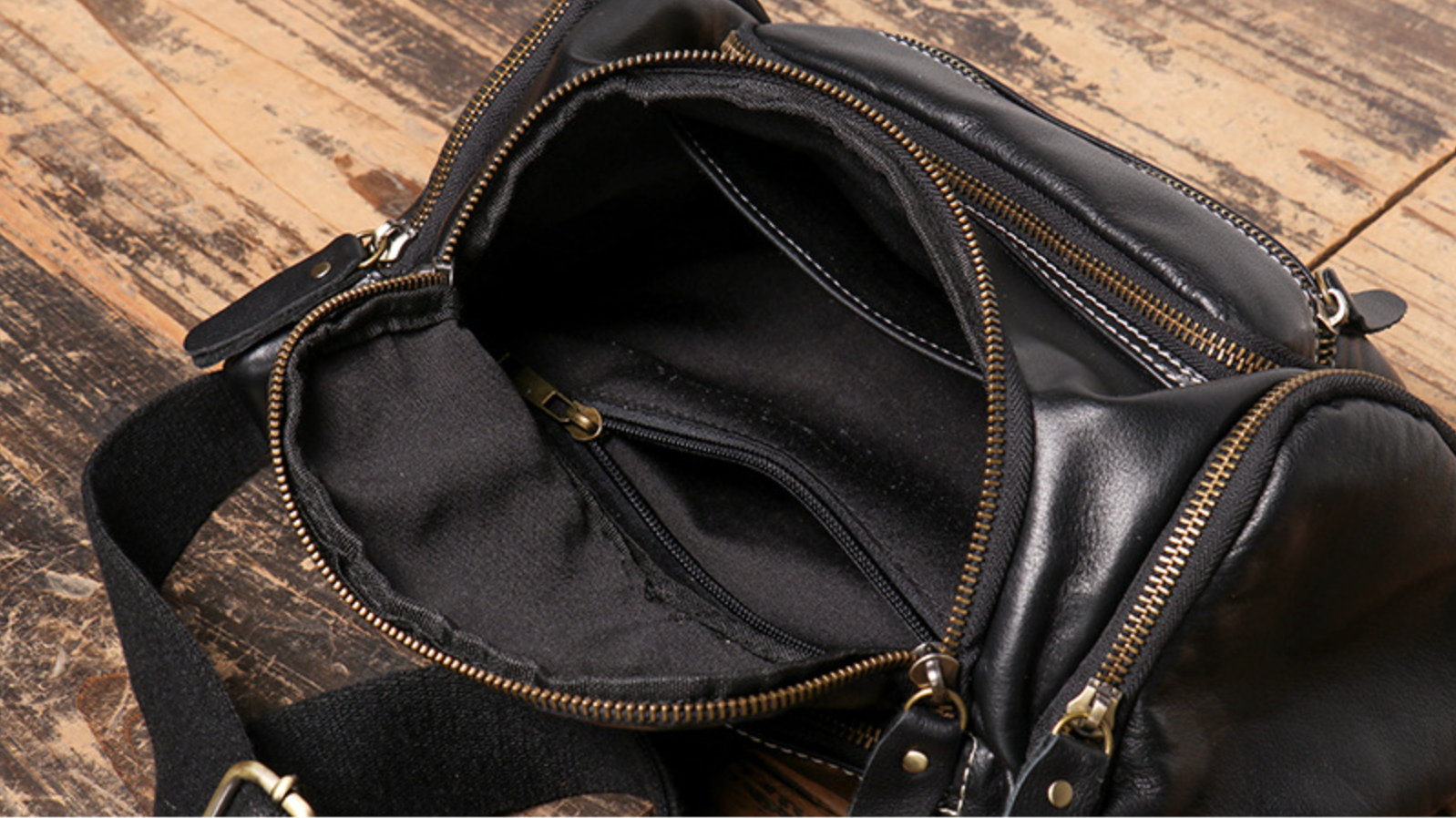 • Genuine leather sling bag storage with side zip compartment for small essentials