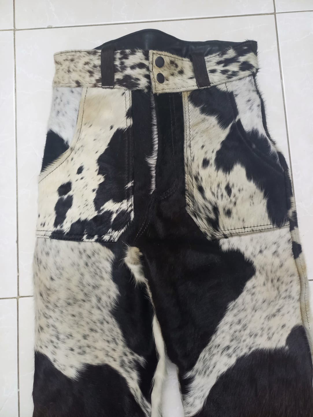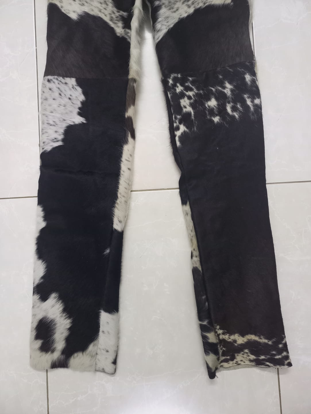 • Hair on cow hide trousers made from genuine cow skin with natural black and white patterns that match the full-length layout shown.