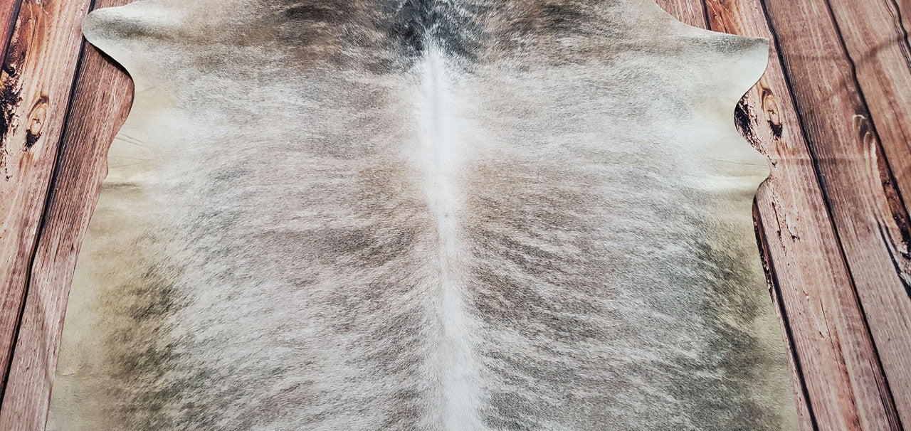 An exotic handpicked brindle cowhide rug mix of grey with tan.