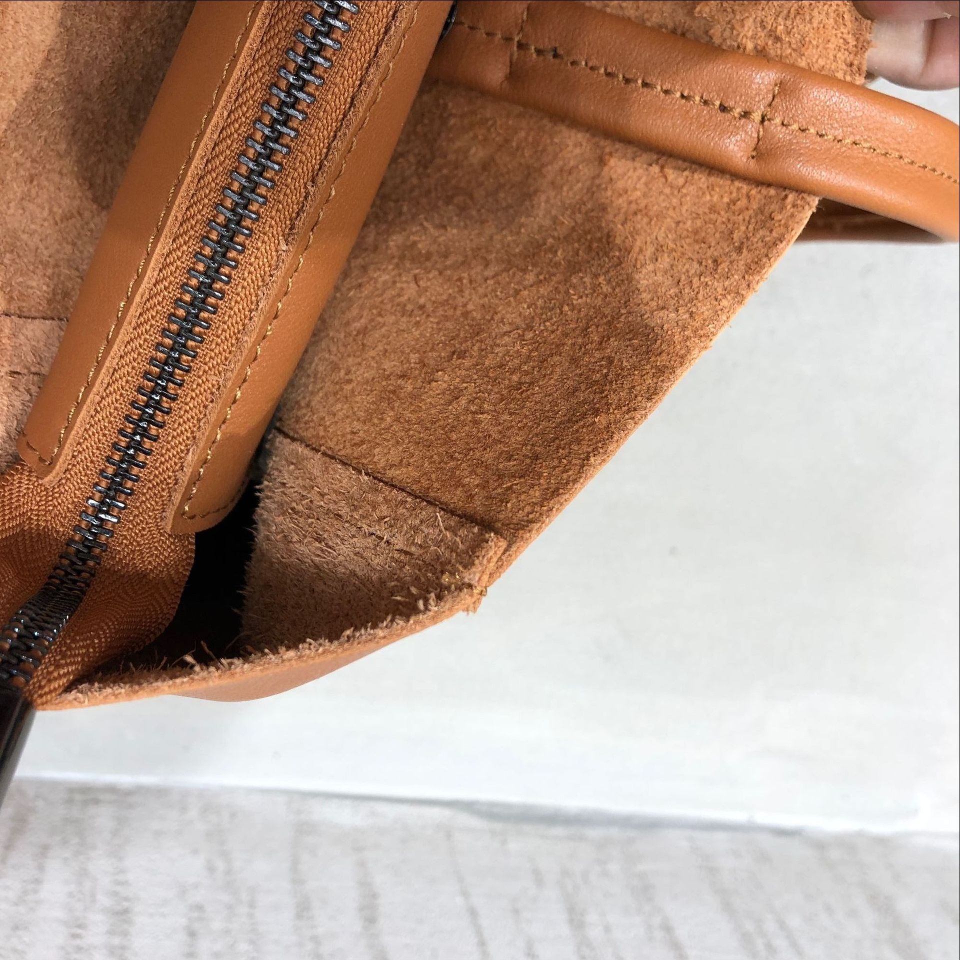 - Leather tote sized to carry daily essentials, documents, and tablets without collapsing