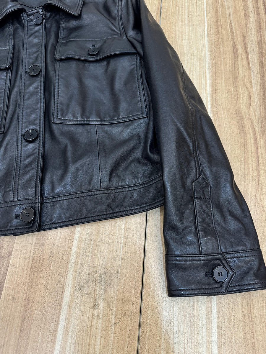 Genuine leather jacket, style, sheepskin suede feel, small lapel, and a workwear silhouette in a clean black finish. This women's leather jacket features a single-breasted front, long sleeves, flap chest pockets, and roomy patch pockets.