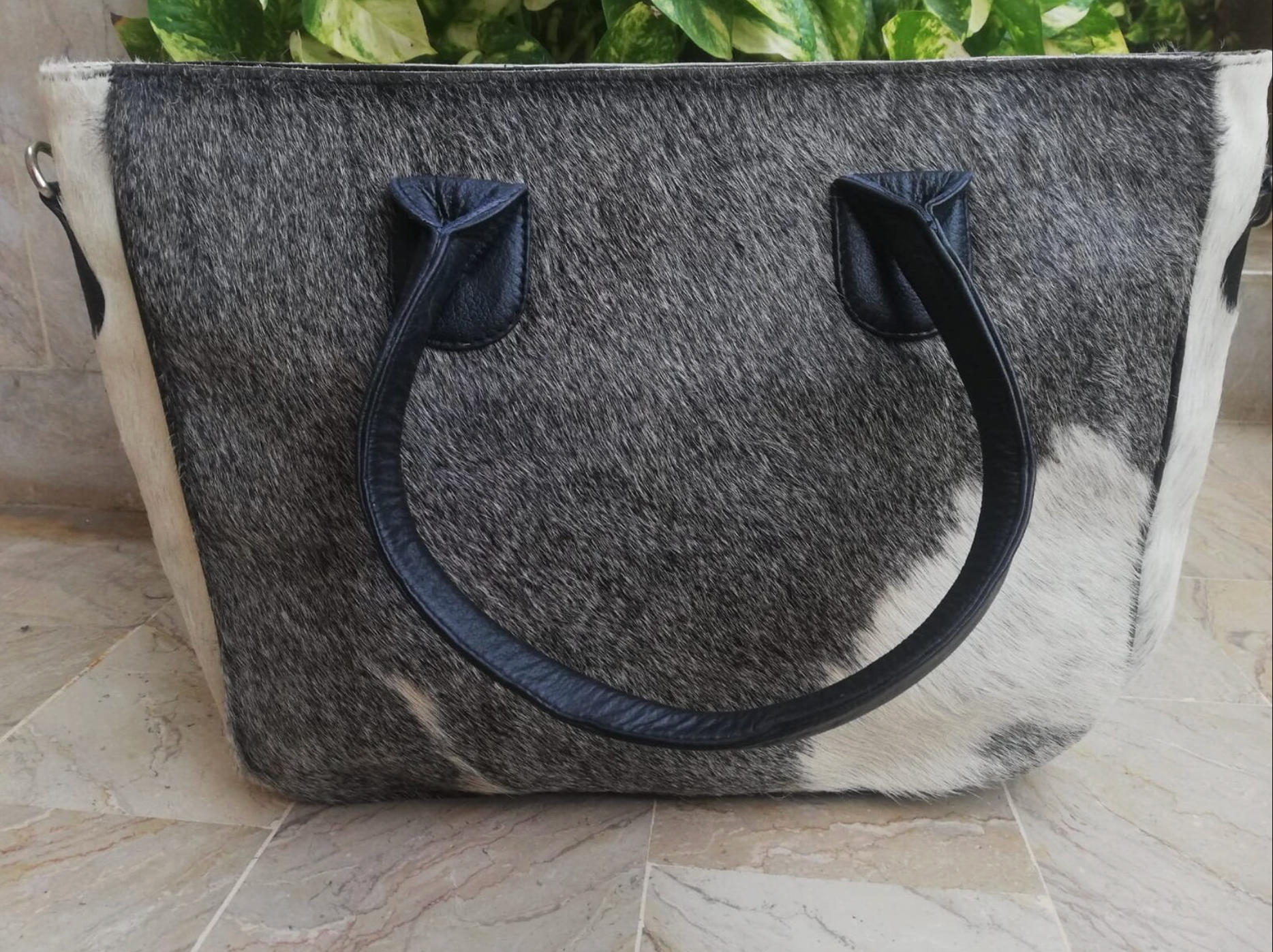 Handmade grey and white hair-on-hide cowhide tote that works as a cowhide bag for everyday carry. use it as a cowhide shoulder purse or carry by hand with leather handles. the roomy main compartment and inside zip pocket keep phone and wallet organized, with soft lining and a safety lock. includes an extendable strap for cow print bags lovers and cow fur shoulder purse styling.