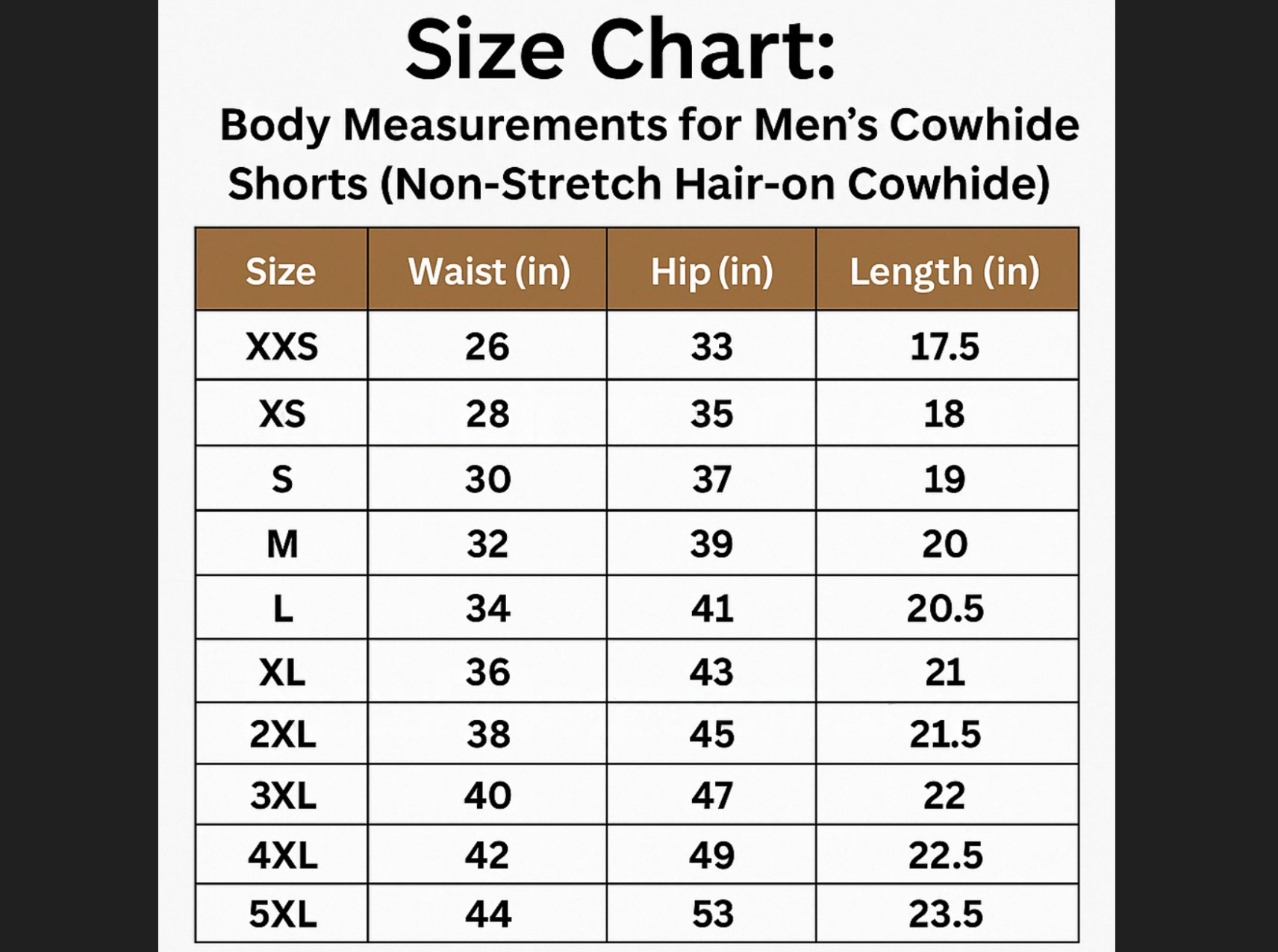 Please check the size chart carefully before ordering. If you need help, message us anytime. Each cowhide shorts pair requires high skill and premium hide, and margins remain very small.