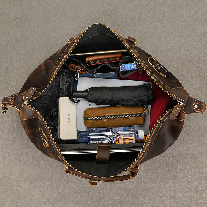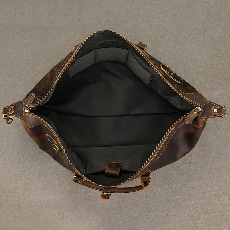 • Adjustable shoulder strap with a thick leather pad for easier cross-body carrying on longer trips using a mens travel leather duffle bag.