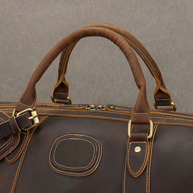 • Full-grain crazy horse leather with rich pull-up tones and reinforced stitching shown across the bag for long service life as a duffle bag leather men option.