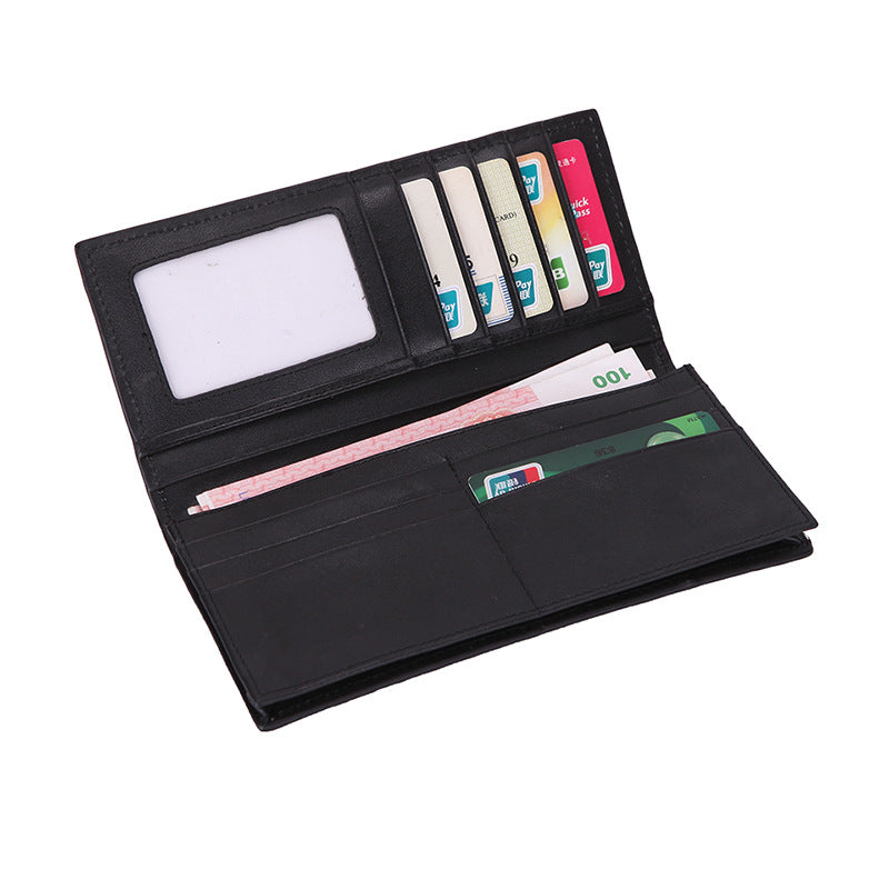 • Vertical men's long wallet layout with deep bill pocket and full-length cash compartment as shown in the internal display photos.