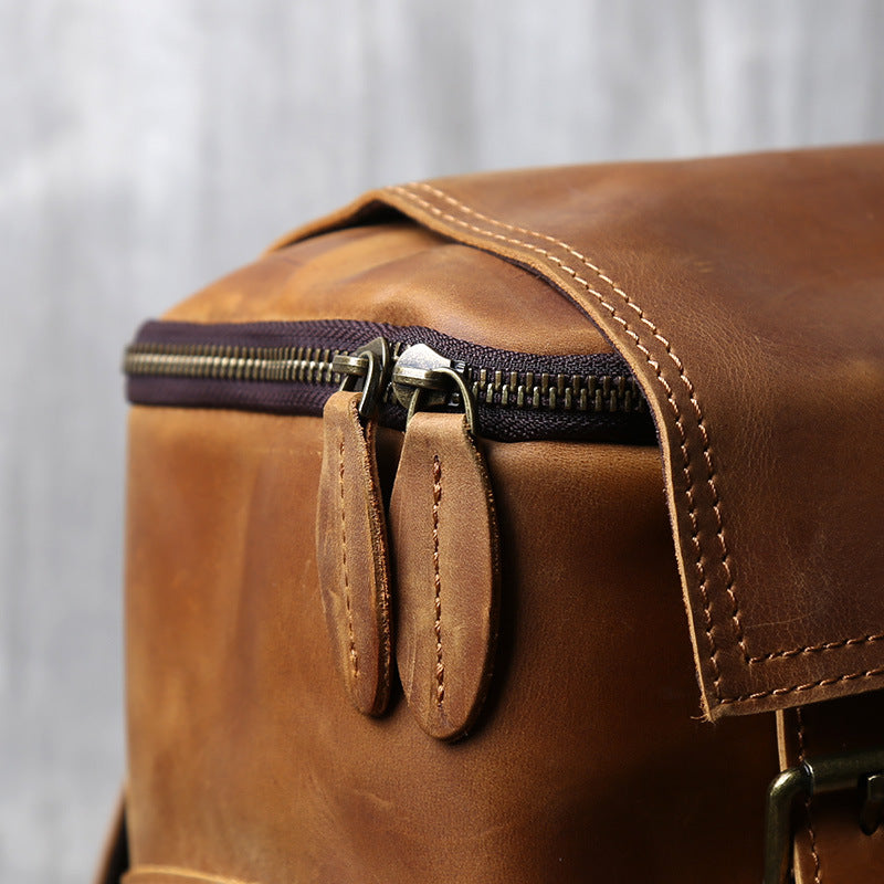 - Heavy-duty metal zippers, reinforced seams, and thick leather straps for daily work use
