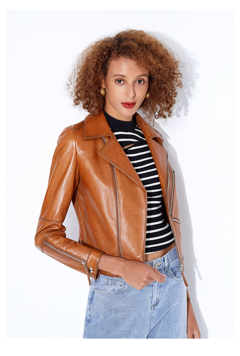 • Genuine sheepskin leather with smooth matte finish providing a clean structured look for leather jacket women slim fit styling
