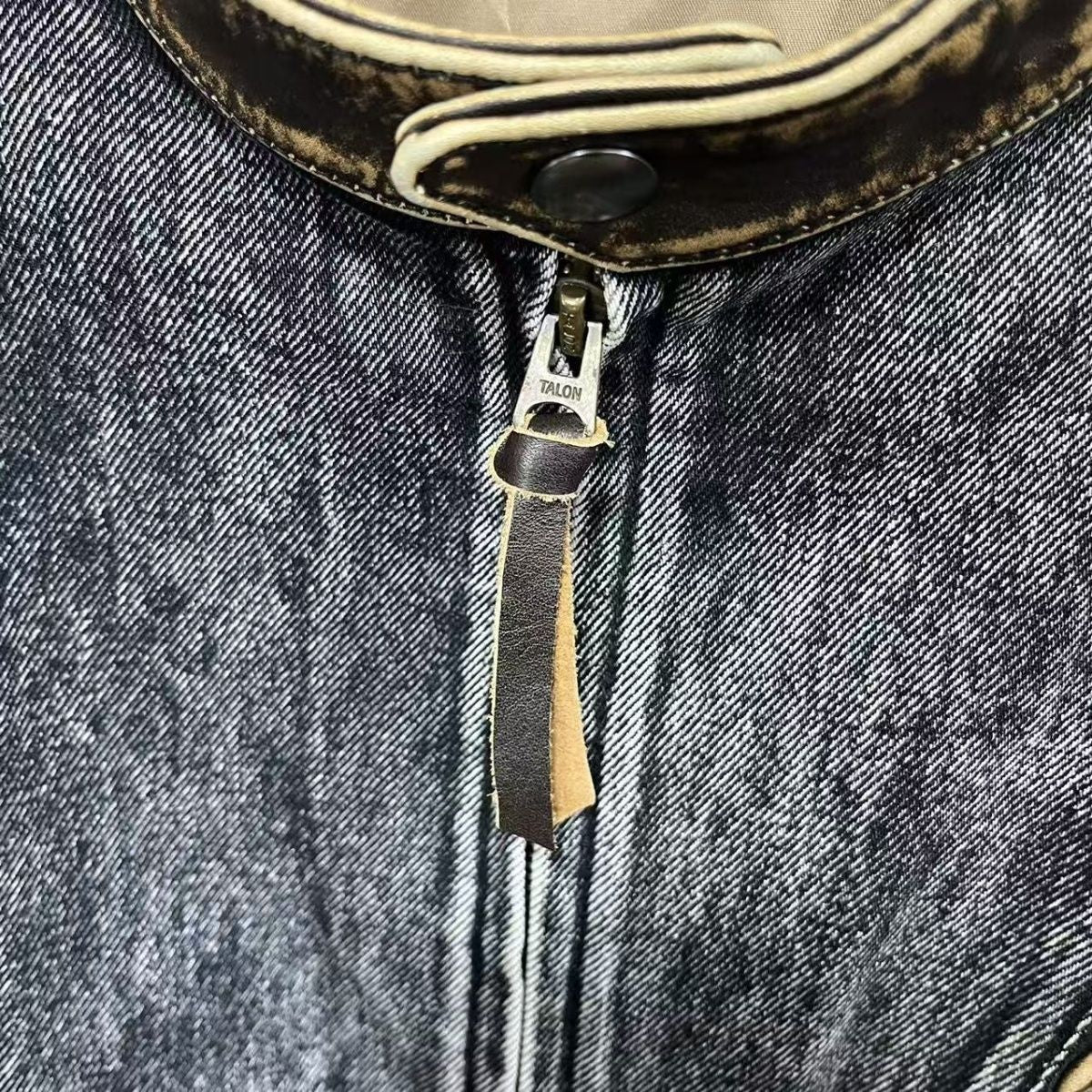 Retro american venom patchwork denim leather jacket made with stretchy imported american denim and distressed oil wax cowhide. Heavy water wash creates an aged, vintage finish, while the stand collar, zip cuffs, and multiple zip pockets suit daily wear and riding. A warm lining supports real leather jacket mens winter needs, pairing well with leather jackets for men and mens leather motorcycle jacket styling.