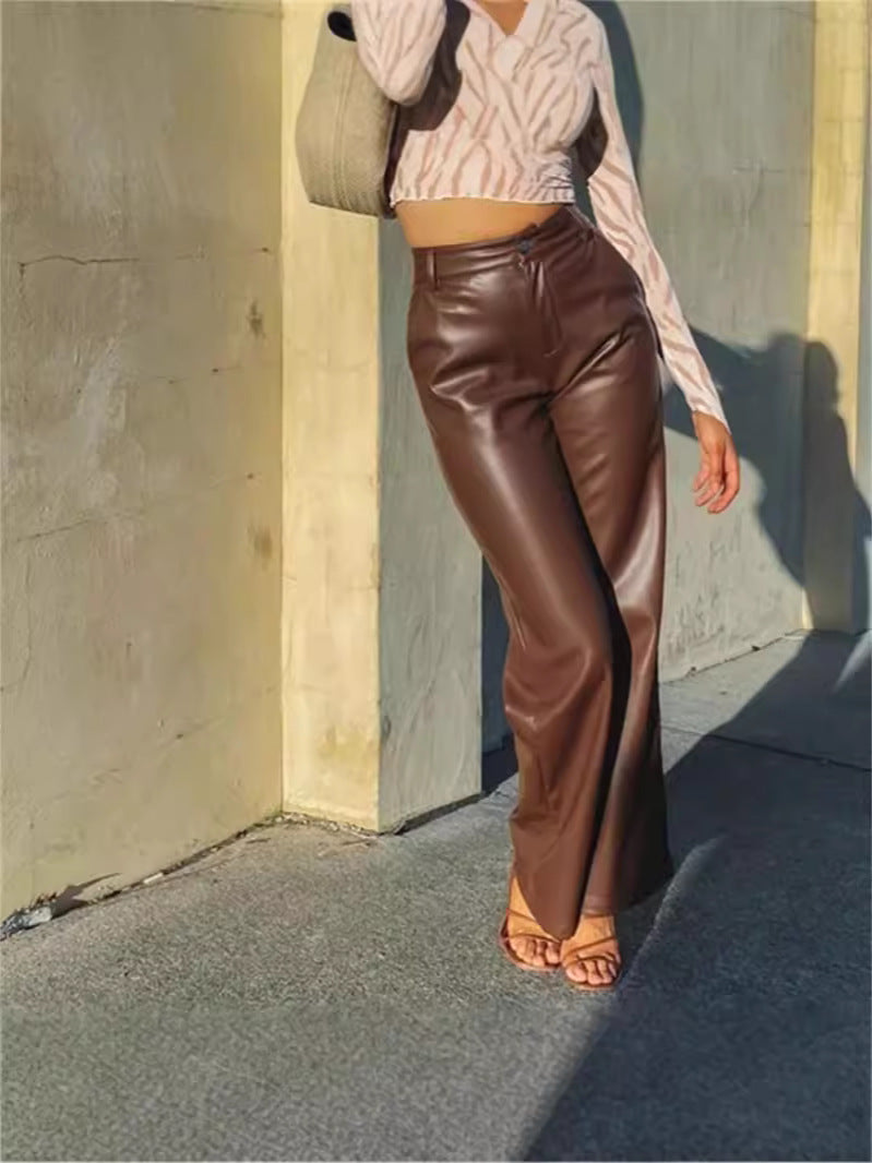 • Faux leather wide leg pants pair easily with cropped tops, knits, or fitted blazers