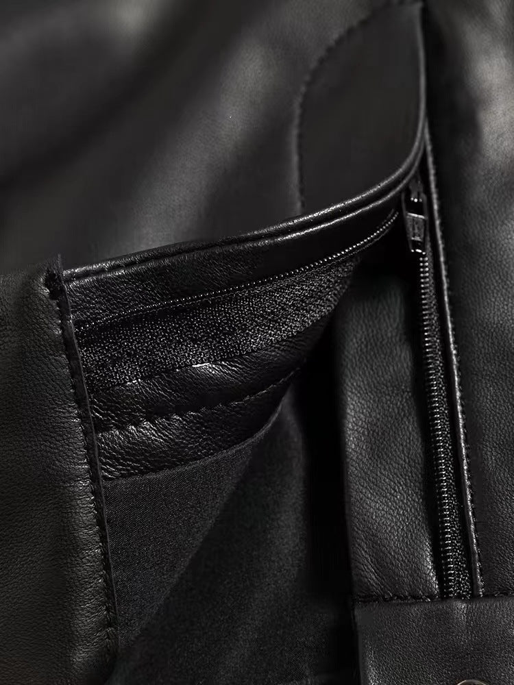 These women leather shorts are made from genuine sheepskin leather in a solid black finish. Designed with a mid-waist slim silhouette, they feature a front button, zipper fly, side pockets, and back welt pockets. The smooth texture and structured drape create a clean, versatile look suitable for spring and autumn styling.