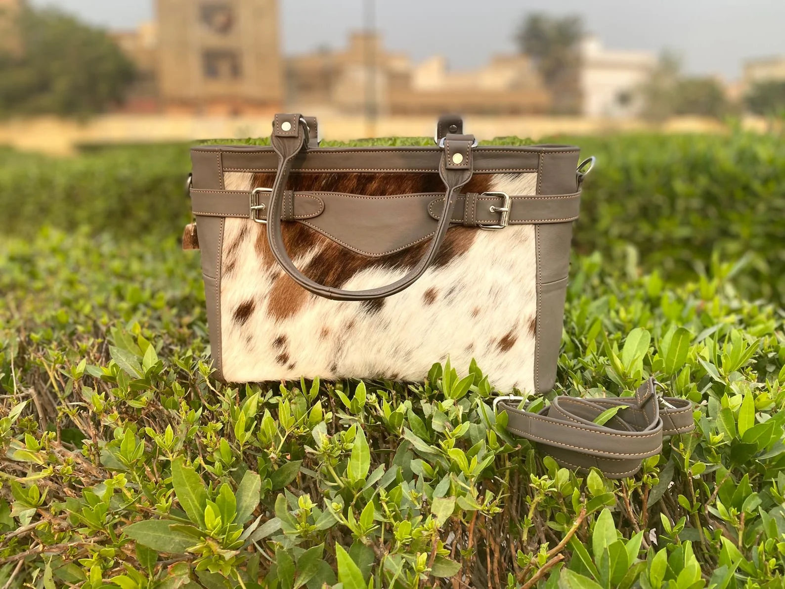 This women cowhide tote bag combines tricolor hair on hide with smooth leather for a bold cow print bags look. Use it as a cowhide bag for work, travel or errands, with cotton/satin lining, two compartments, two pockets and one hidden pocket. Carry by hand or wear it as a cowhide shoulder purse using the extendable strap, similar to a cow fur crossbody purse.