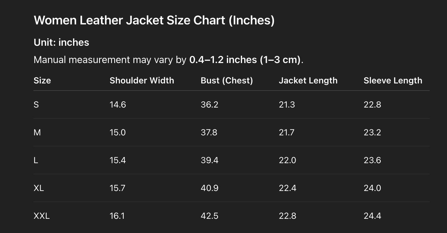 • Please review the size chart carefully before ordering and contact us if you need guidance, as each leather petite jacket uses premium materials and skilled labor with very small margins