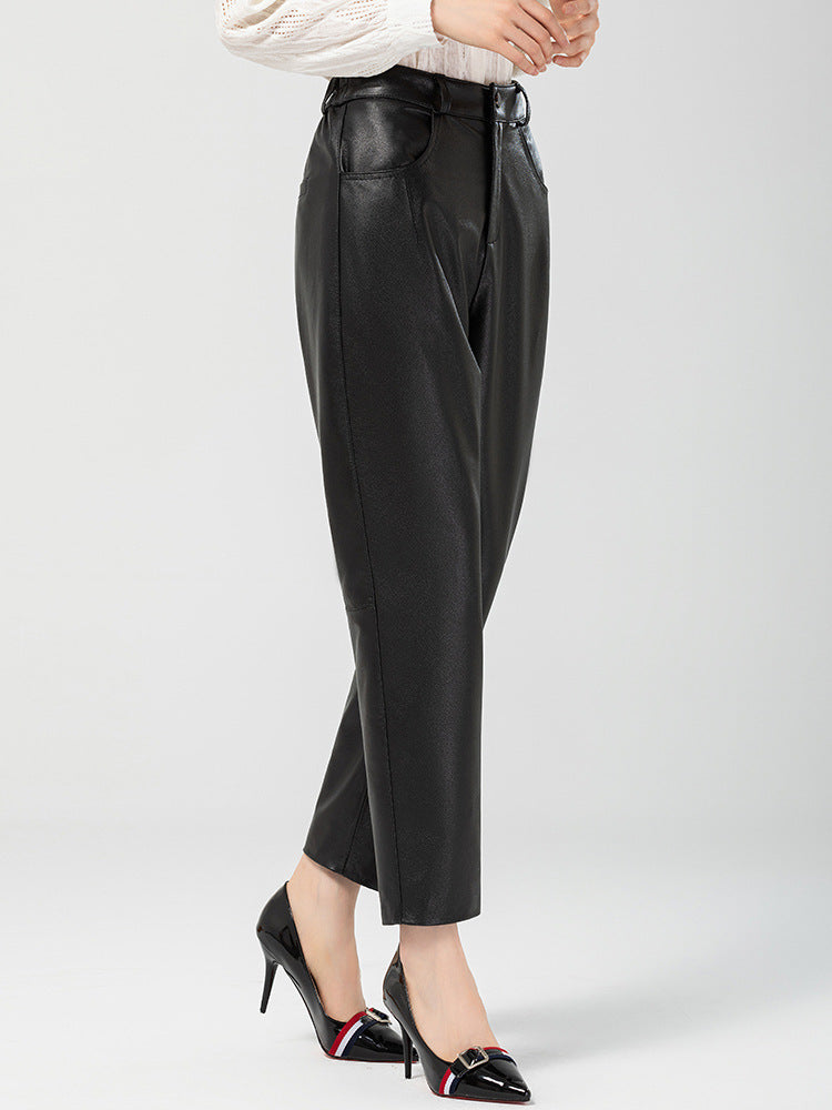 Women's genuine leather trousers in top layer cowhide with a loose harem cut and high rise waist. Designed as high waisted leather pants for women who want a slimming casual fit with room through the hip and a tapered ankle. These women harem leather trousers deliver a smooth black finish, making them black leather pants for women and women's black leather pants that pair easily with daily outfits.