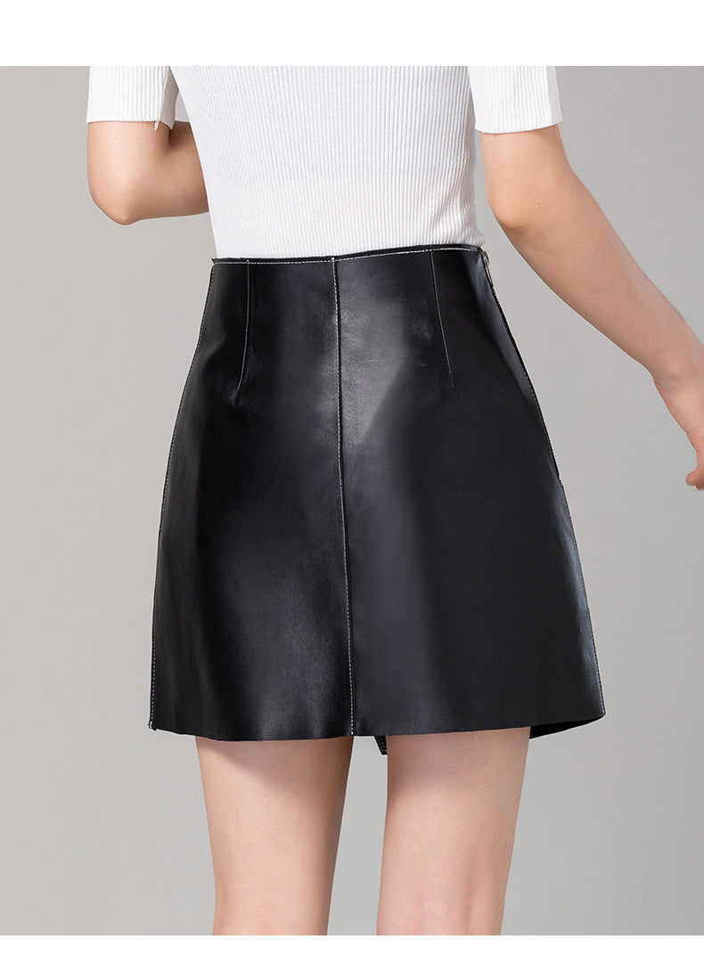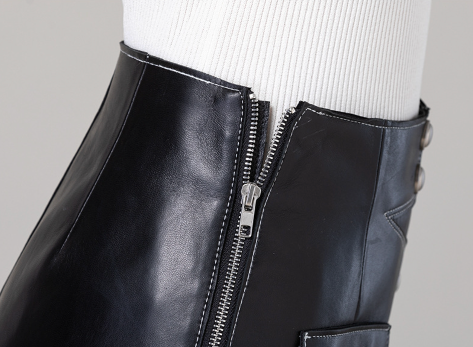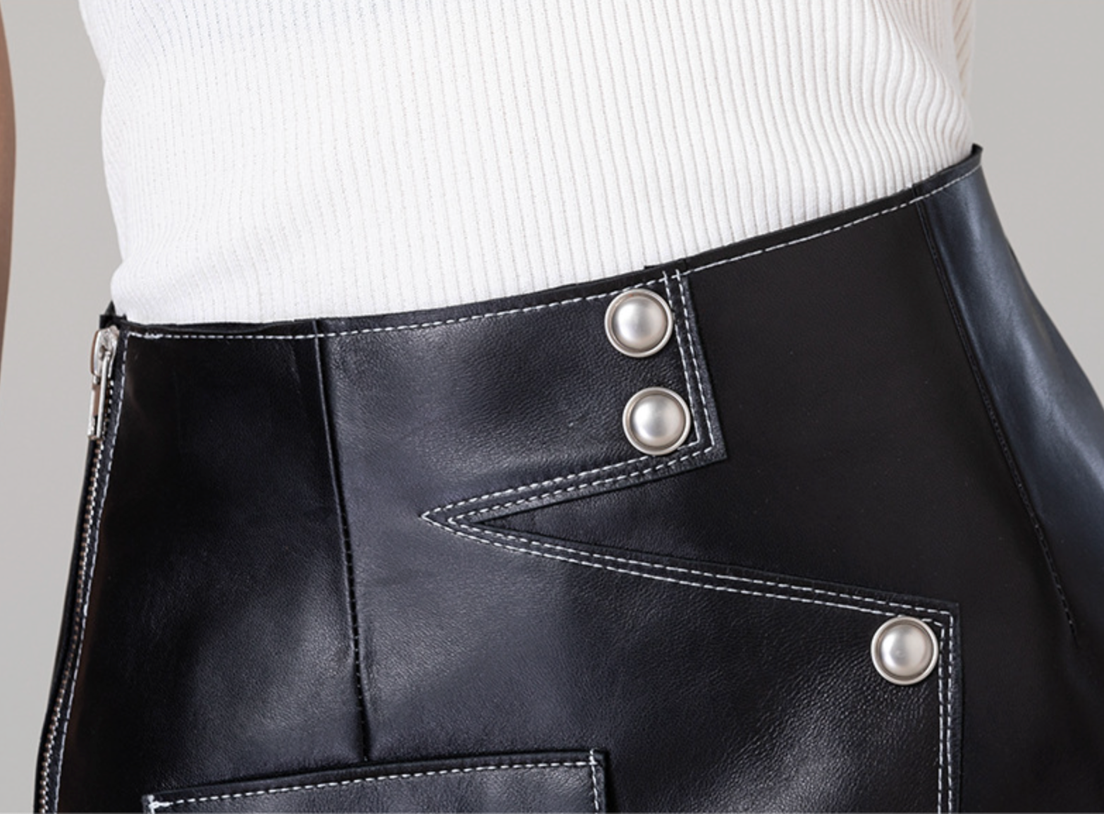 This women leather skirt blends a smooth leather skirt feel with a high waist and asymmetrical wrap front. Designed as a women mini leather skirt, it features snap studs, contrast stitching, and a side zipper for clean wear. The silhouette supports a mini leather bodycon skirt look while keeping a slight a-line shape. Ideal for buyers searching black leather pleated mini skirt styling with a bold wrap finish.