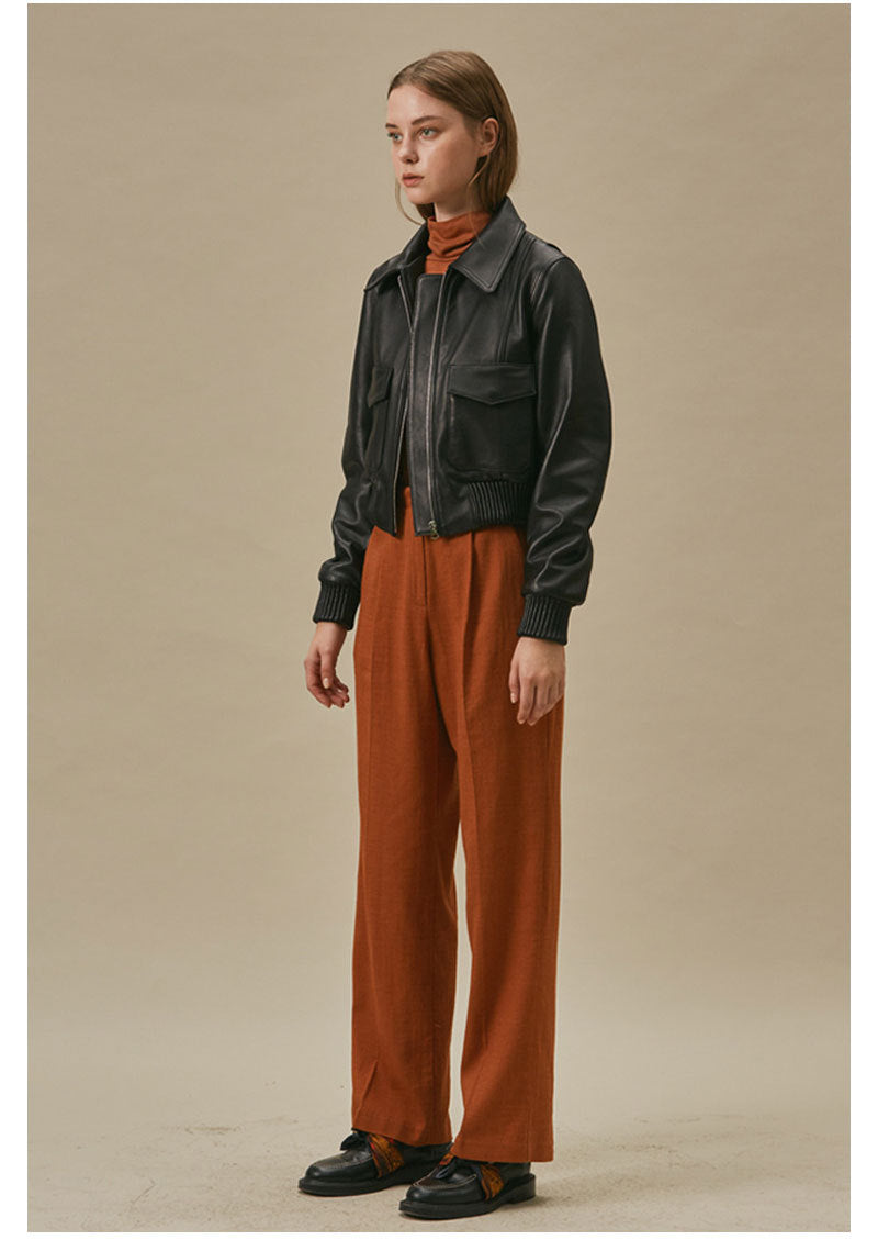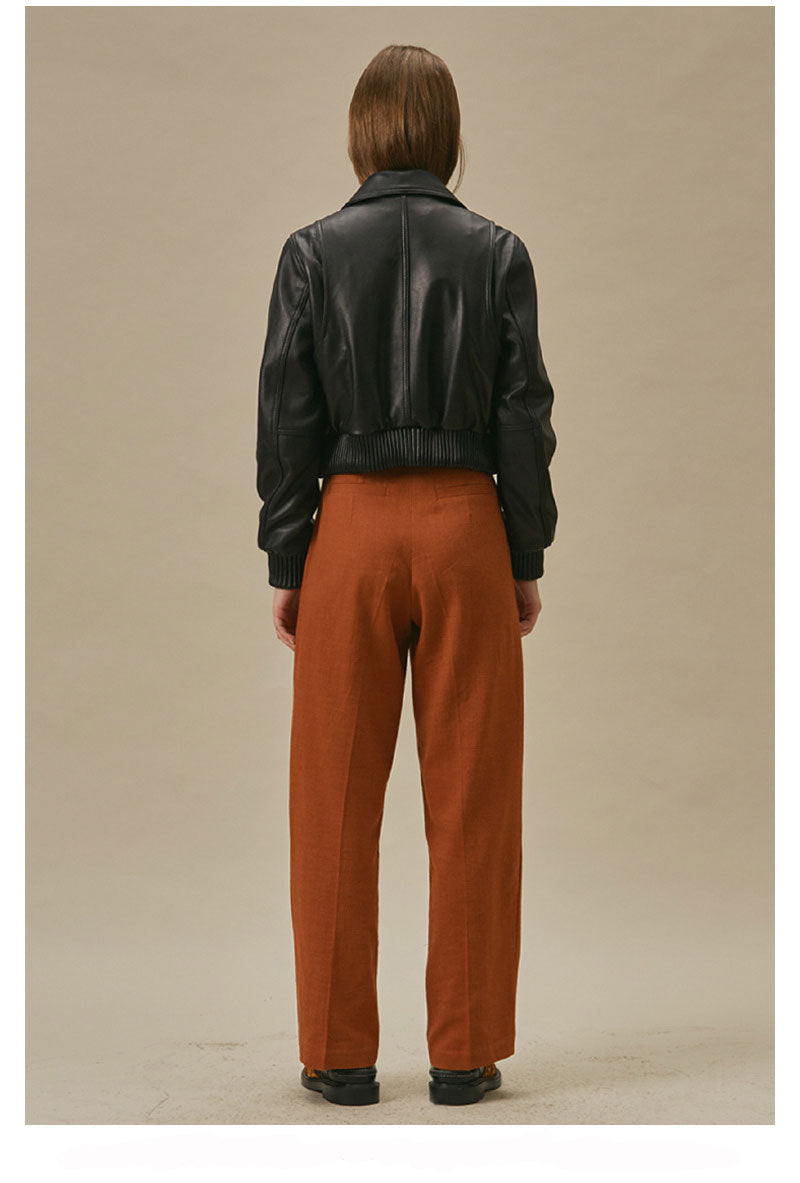 • The slim fit leather jacket womens silhouette matches the cropped length seen in the photos, sitting comfortably above the waistline.