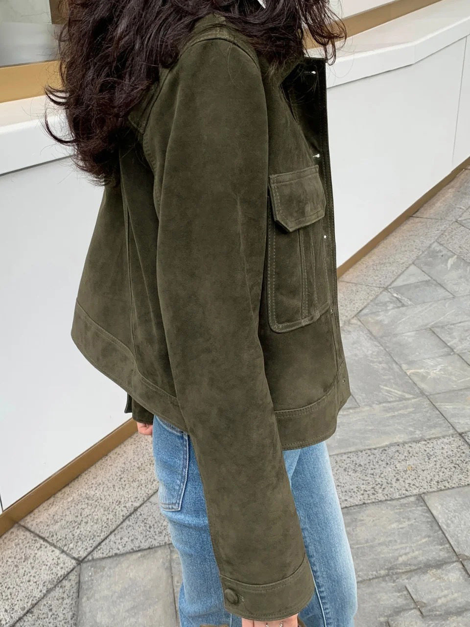 Petite workwear outerwear made from women's genuine leather goatskin suede jacket in olive tone, finished with flap chest pockets and suede-covered buttons. This women suede jacket layers easily over tees and knits, while the cropped cut keeps outfits clean and balanced. If you like suede blazer womens styling with a casual pocket coat feel, this women's suede jacket is a strong daily option.